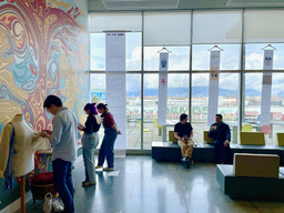 Image of installation comprised of a large-scale receipt, banners on clothing hangers, seamstress mannequin, cardigan, tote bag, sneakers, ottoman, sewing materials and tools, online Padlet conversation board, & pamphlet. Approx. 9 x 19 feet. Cafeteria at ECU.